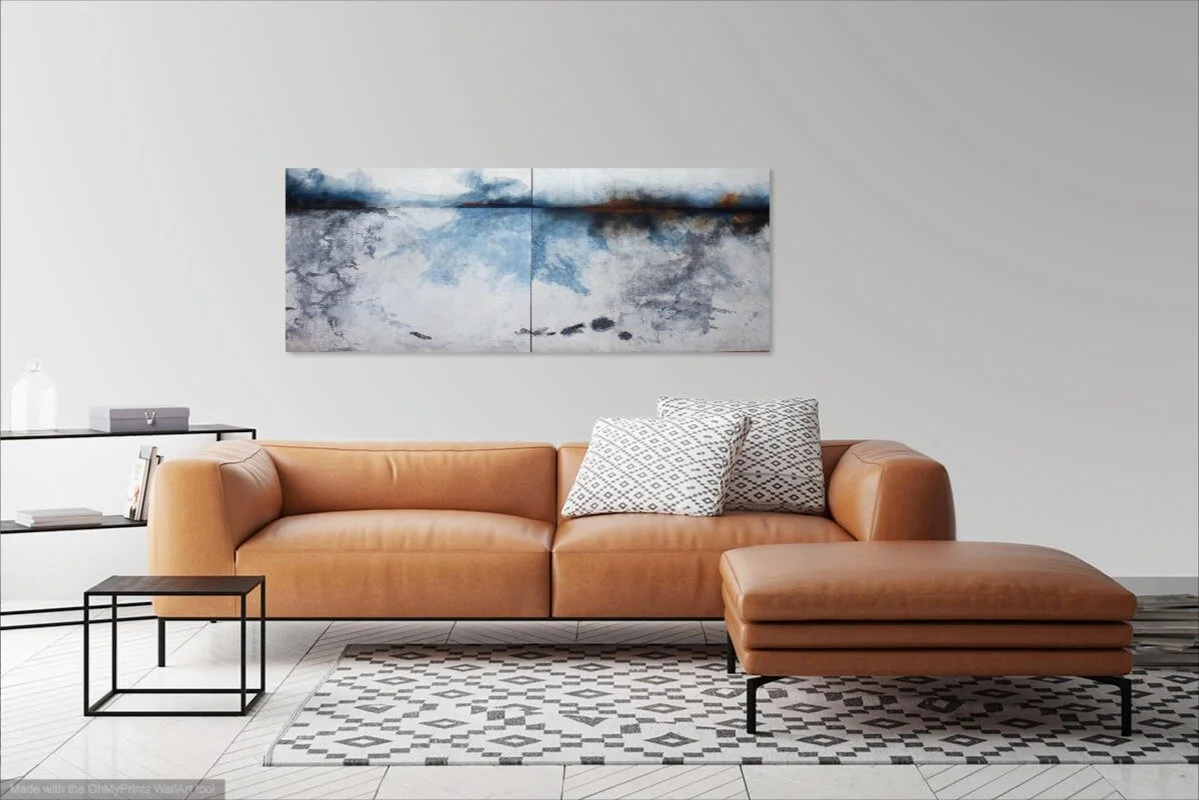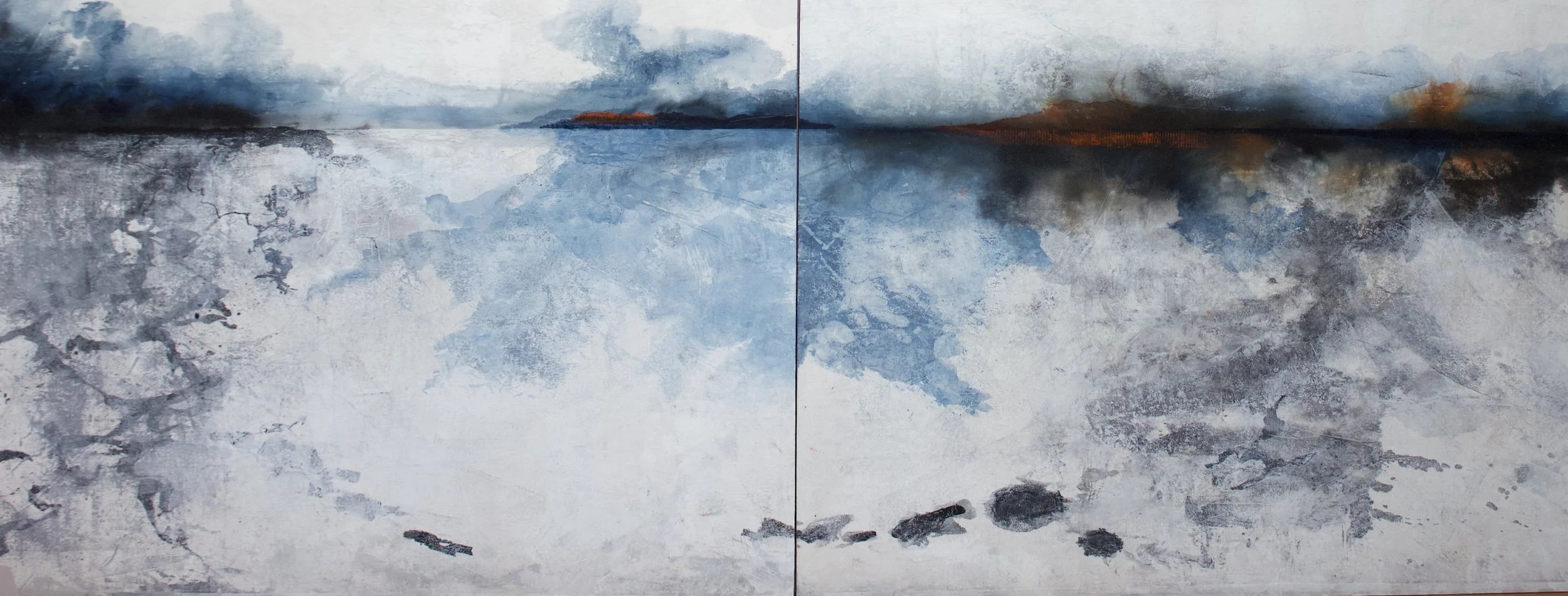 THE EVENING BREEZE LIFTED US ALONG diptych. 48 inches x 18 inches, acrylic, ink and oil pastel on mulberry paper mounted on cradled birch panel, 2022. $1500 CAD SOLD
