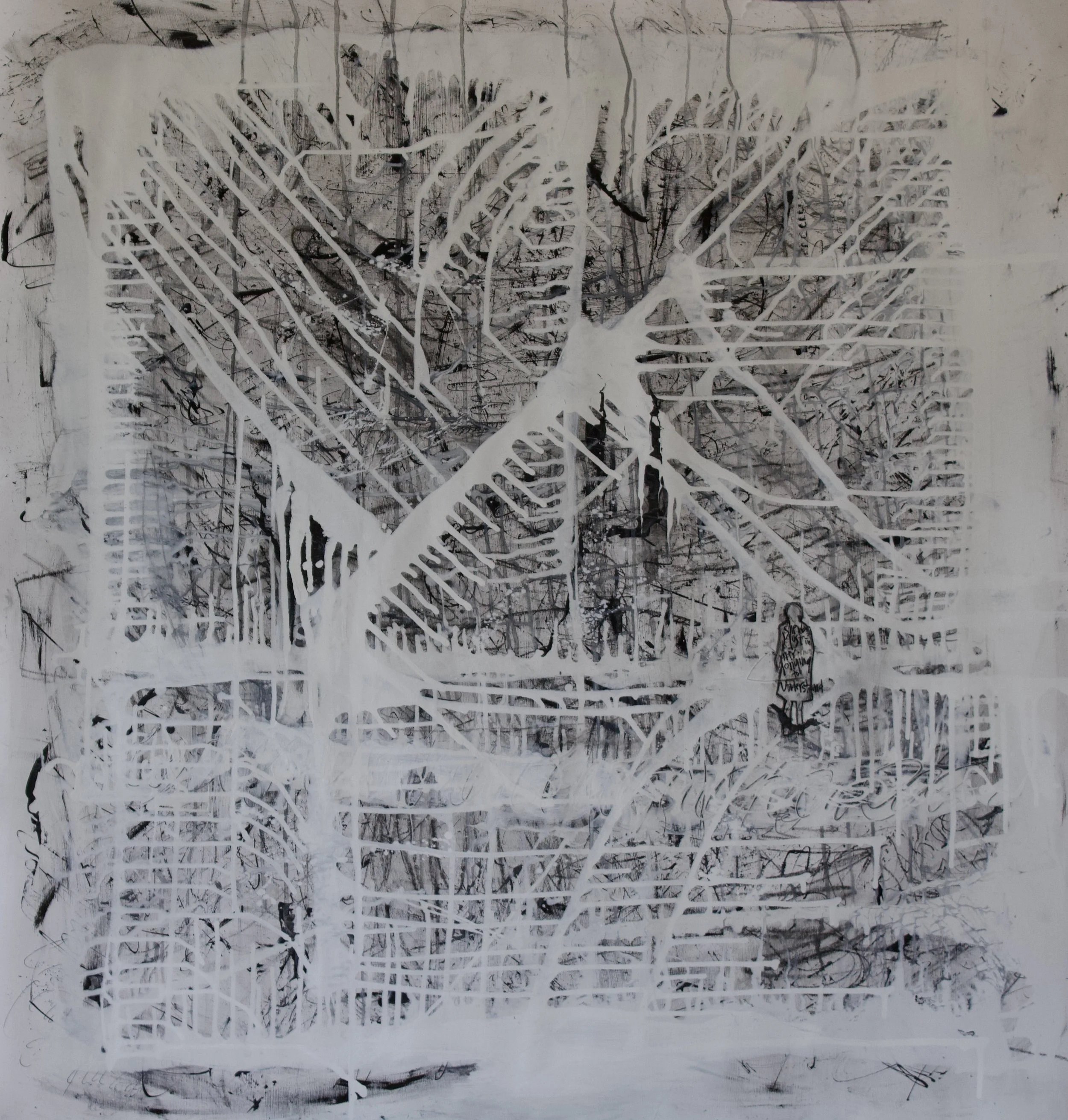 Lost in Longing, 42 inches x 42 inches, ink, charcoal, and acrylic on paper. 2025. Available for viewing October 3 - 19th at arc.hive artist run centre as part of the Writ Large - Contemporary Works on Paper group exhibition w Georgina Montgomery and Louise Oborne. $550 CAD